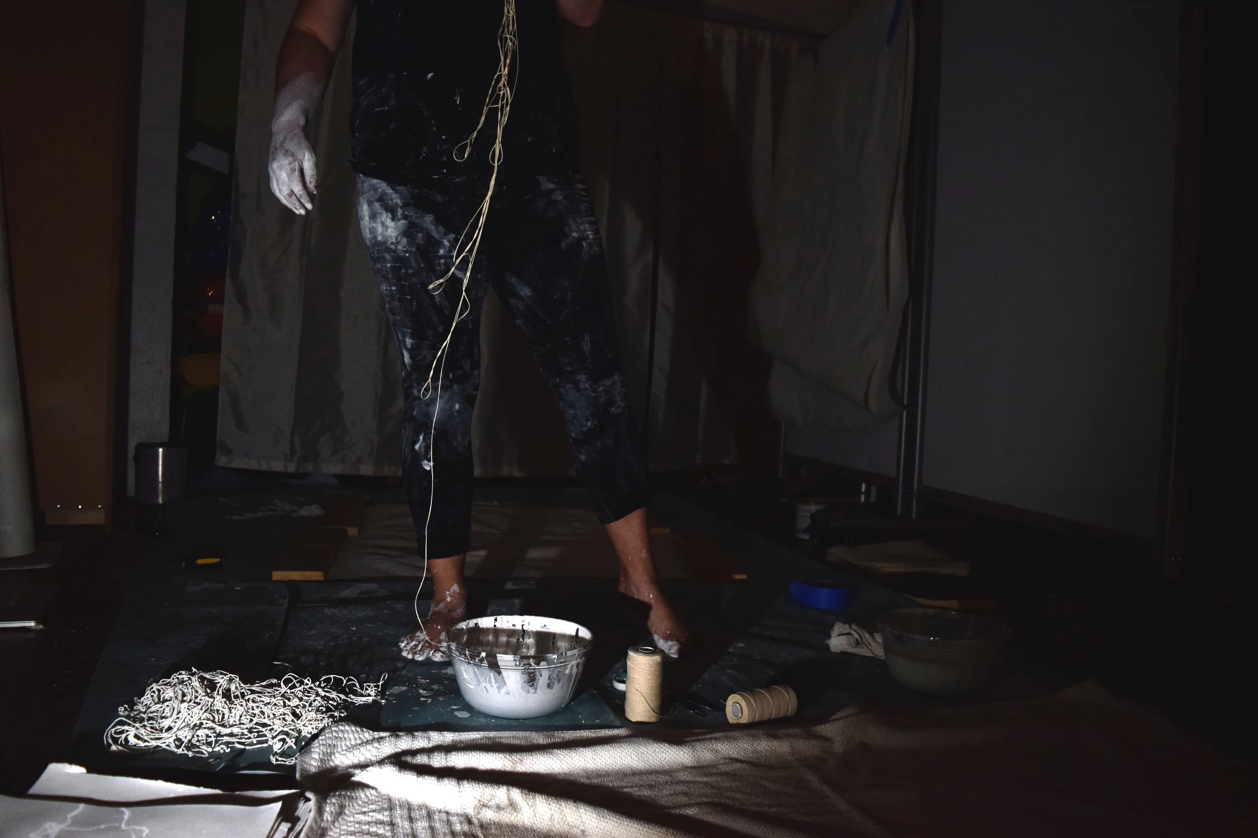 BY-PRODUCT begins with activation, a performance involving common materials to accomplish visceral experiences and artworks. I soak butcher’s twine in latex paint, then masticate it with my hands and feet against paper on the ground (creating a painting). I pull monoprints of each piece of string by stomping on the damaged twine between two pieces of paper and two pieces of wood. Repetition generates sculptural objects and monoprints.